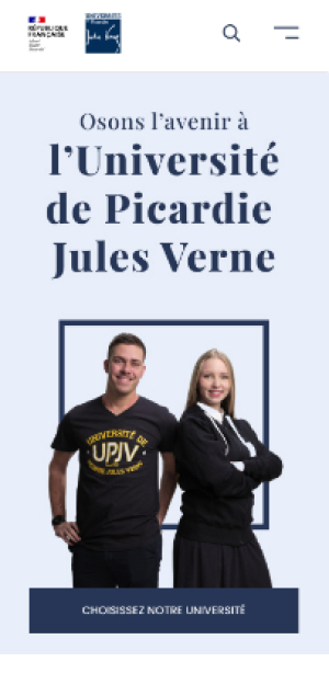 La page "Pourquoi choisir l'UPJV" met en avant la qualité de vie sur les campus de l’Université de Picardie Jules Verne à travers un design moderne et interactif. Une frise animée guide les visiteurs, dévoilant progressivement les atouts de l'UPJV, tels que ses équipements modernes, ses espaces sportifs et culturels, et ses services de soutien à la vie étudiante. Ce design dynamique améliore l’expérience utilisateur en rendant l'information plus engageante et visuellement attrayante. L'UPJV illustre ainsi son engagement envers un cadre de vie agréable et stimulant, offrant un environnement propice à l'épanouissement académique et personnel.